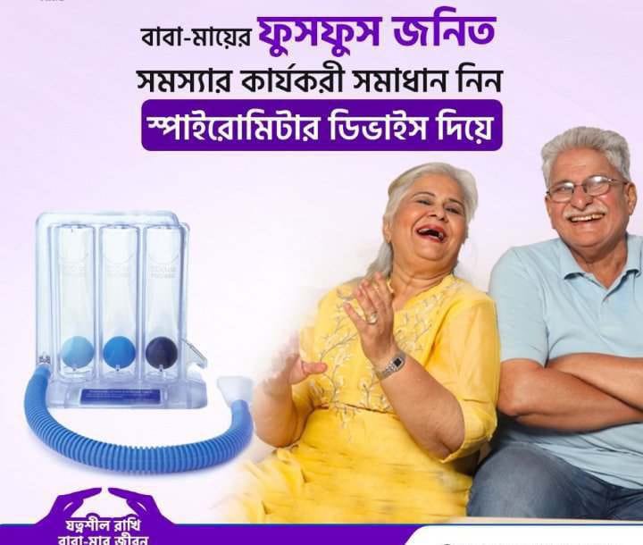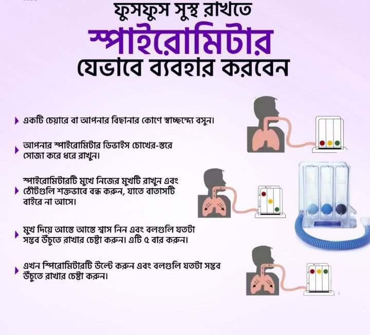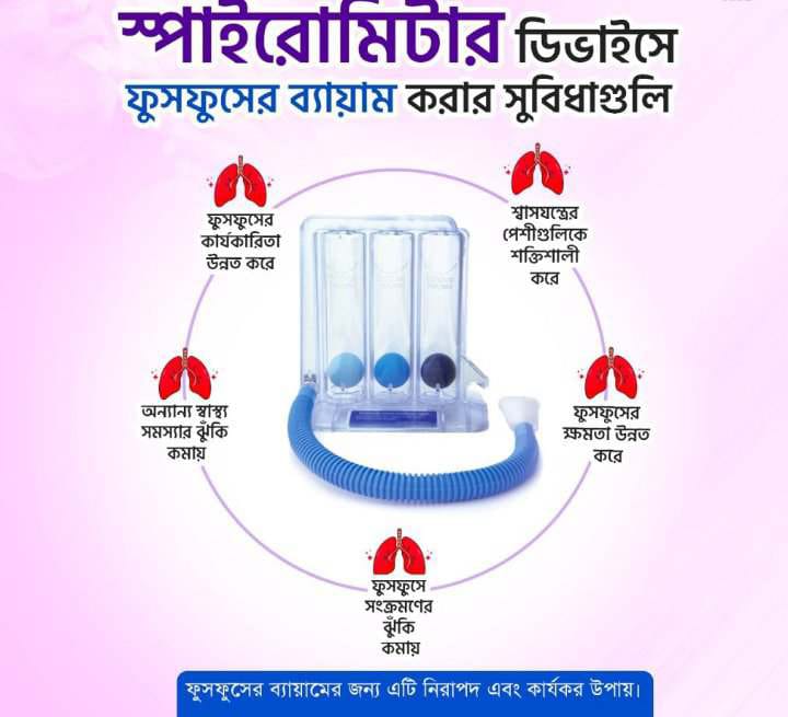 * এই স্পাইরোমিটারটির ব্যবহার করলে ফুসফুসের এই বায়ুথলি গুলো সচল হয়। ফলে ফুসফুস থাকে পূর্ণ কার্যক্ষমতা সম্পন্ন।